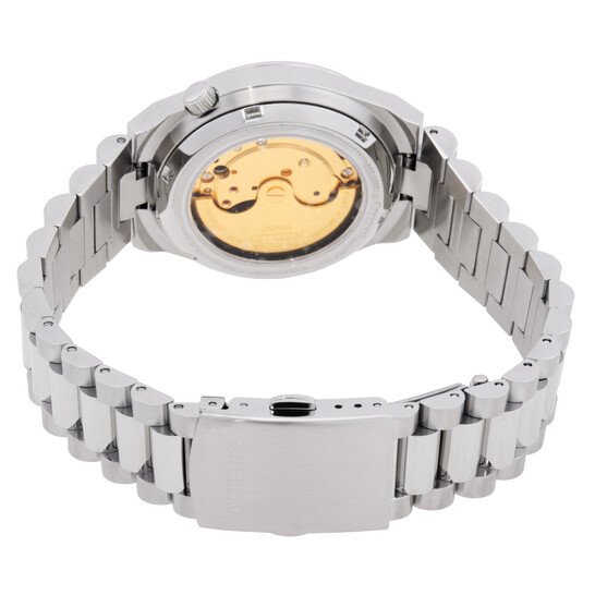 Silver-tone stainless steel case and bracelet. Fixed silver-tone stainless steel bezel. Ice blue dial with silver-tone hands and index hour markers. Minute markers around the outer rim. Dial Type: Analog. Date display at the 3 o’clock position. Citizen Caliber 8210 Automatic movement, containing 21 Jewels, bitting at 21600 vph, and has a power reserve of approximately 42 hours. Scratch resistant sapphire crystal. Transparent see through case back. Round case shape, case size: 37 mm. Band width: 9 mm. Fold over clasp with a safety release. Water resistant at 50 meters / 165 feet. Functions: date, hour, minute, second. Tsuyosa Series. Casual watch style. Watch label: Japan Movt. Citizen Tsuyosa Automatic Ice Blue Dial Watch NJ0200-50L.